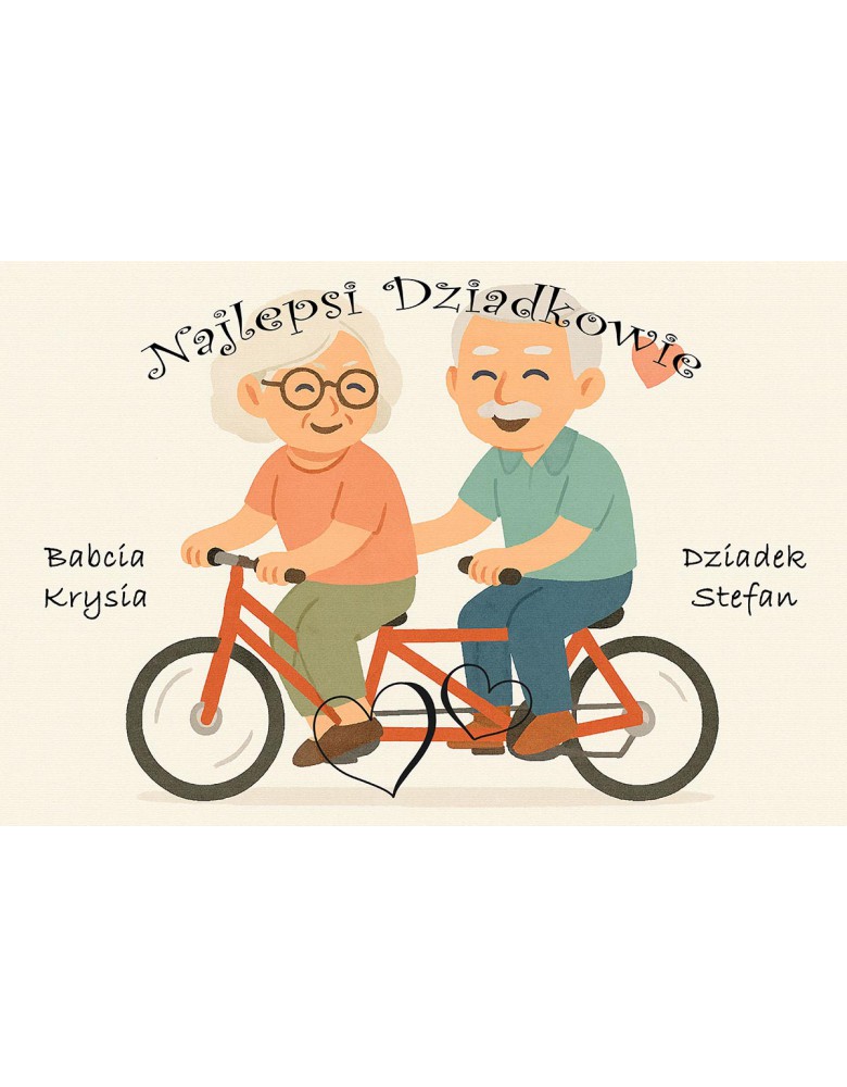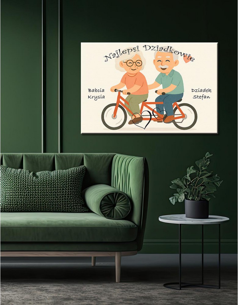 Ten obraz na płótnie doskonale sprawdzi się jako wzruszający fotoprezent od wnuków lub całej rodziny. Scena jazdy na tandemie nawiązuje do wspólnych chwil, wzajemnego wsparcia i radości płynącej z bycia razem – niezależnie od wieku.