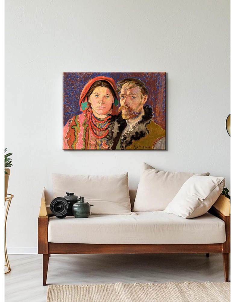Reprodukcja obrazu Stanisław Wyspiański „Autoportret z żoną” drukowana na bawełnianym płótnie o dużej gramaturze. Obraz oprawiony na sosnowym blejtramie 20 mm, zadrukowane boki – gotowy do powieszenia.