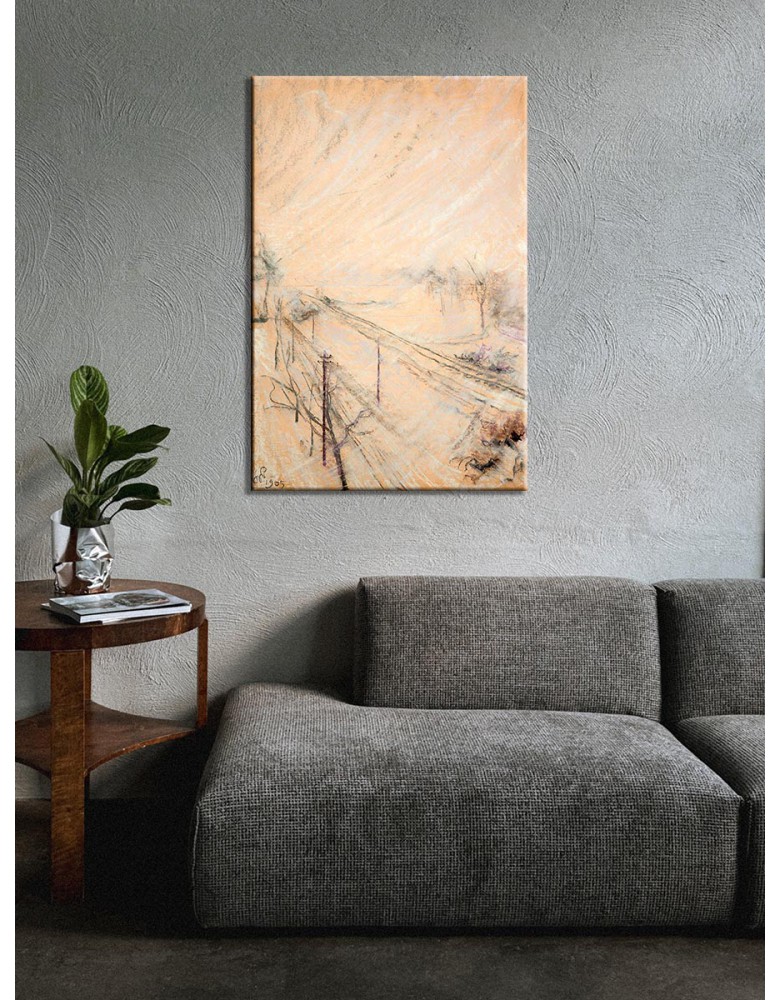 Reprodukcja obrazu Stanisław Wyspiański „Widok na Kopiec Kościuszki. Zadymka” drukowana na bawełnianym płótnie o dużej gramaturze. Obraz oprawiony w sosnowy blejtram 20 mm, zadrukowane boki – gotowy do powieszenia.