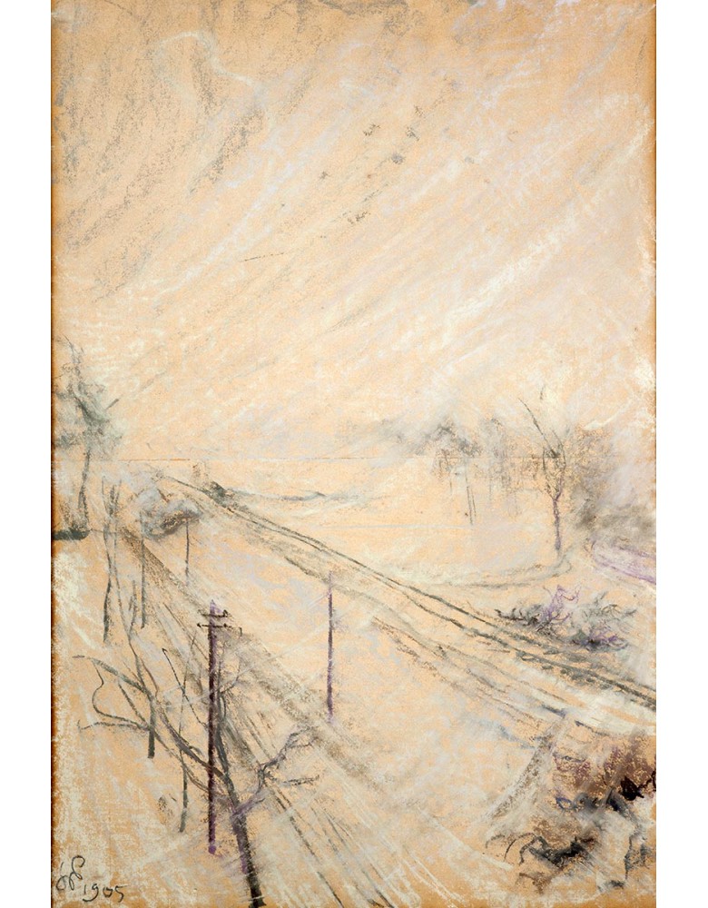 „Widok na Kopiec Kościuszki. Zadymka” to pełen ekspresji obraz autorstwa Stanisława Wyspiańskiego, przedstawiający krakowski pejzaż w czasie zimowej śnieżycy. Charakterystyczny Kopiec Kościuszki, ledwie widoczny wśród wirujących płatków śniegu, staje się częścią surowego i dynamicznego krajobrazu. Wyspiański mistrzowsko oddał atmosferę zadymki – zacierające się kontury, rozedrganą linię i zimną paletę barw, które podkreślają siłę natury i jej wpływ na otoczenie. To dzieło pokazuje nie tylko jego fascynację krakowskimi widokami, ale też umiejętność oddania ulotnych chwil i nastrojów.