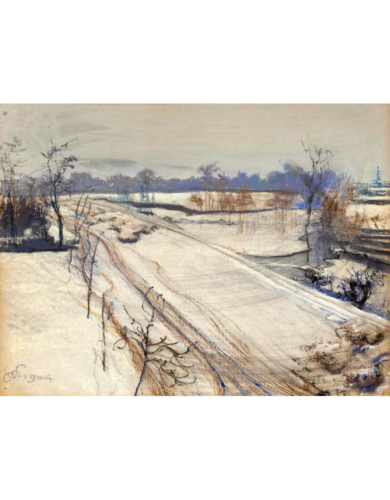 „Widok z okna na Kopiec Kościuszki. Szary dzień” to niezwykły pejzaż autorstwa Stanisława Wyspiańskiego, ukazujący krakowski krajobraz widziany z perspektywy pracowni artysty. W centrum kompozycji znajduje się monumentalny Kopiec Kościuszki, spowity zimową szarością. Stonowane barwy i oszczędna kolorystyka oddają atmosferę melancholijnego dnia, w którym natura jawi się w swojej cichej, wyciszonej odsłonie. Obraz ten stanowi przykład umiejętności Wyspiańskiego w przekształcaniu codziennych widoków w dzieła o głębokim nastroju i poetyckim wyrazie.