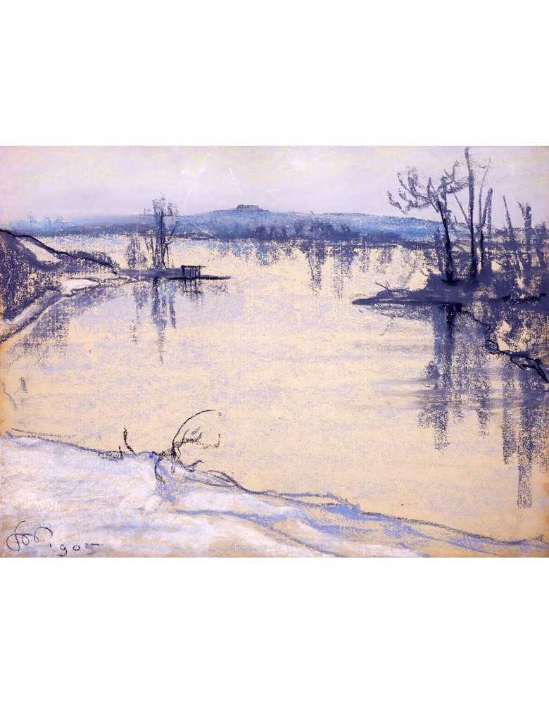 „Wisła pod Krakowem” to malarski pejzaż autorstwa Stanisława Wyspiańskiego, w którym artysta uchwycił majestat królowej polskich rzek w otoczeniu krakowskiego krajobrazu. Spokojny nurt Wisły, szeroko rozciągającej się w kompozycji, kontrastuje z miękkimi liniami drzew i dalekim horyzontem miasta. Stonowana kolorystyka i subtelna gra światła nadają scenie melancholijnego, a zarazem poetyckiego charakteru. Obraz ten jest przykładem niezwykłej wrażliwości Wyspiańskiego na naturę i jej związki z kulturą oraz historią Krakowa.