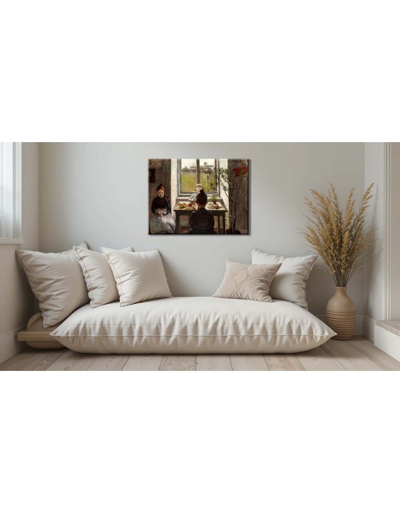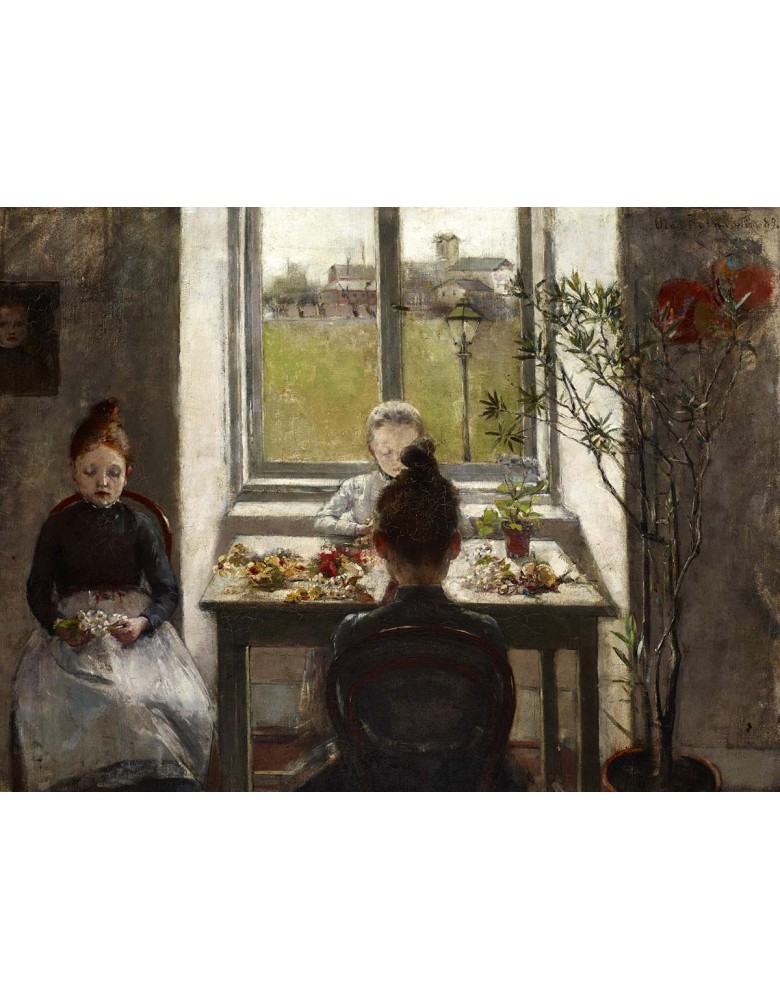 Postacie ukazane są z niezwykłą wrażliwością – ich twarze zdradzają zamyślenie, a nieco powściągliwa kolorystyka podkreśla emocjonalną głębię sceny. Kwiaty, choć nienachalne, wprowadzają akcent życia i świeżości, tworząc piękny kontrast z matowym tłem. Całość zachowuje charakterystyczny dla Boznańskiej klimat intymności i obserwacji codzienności.