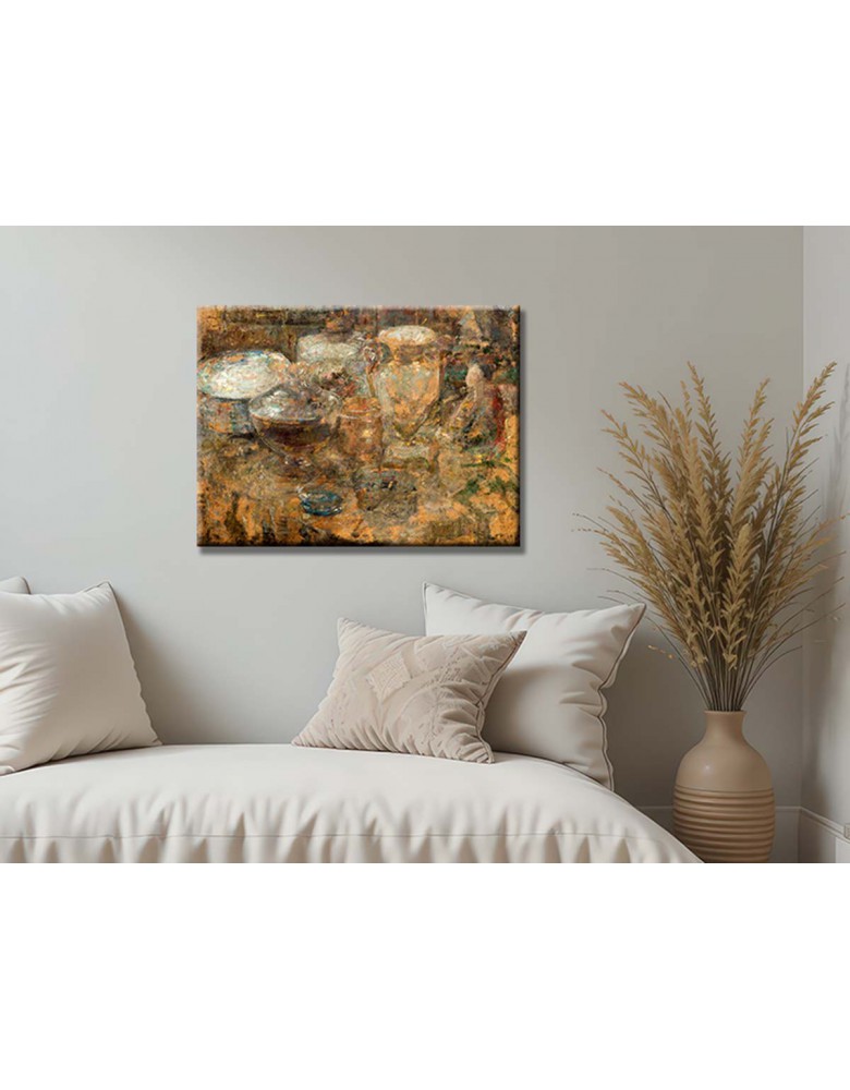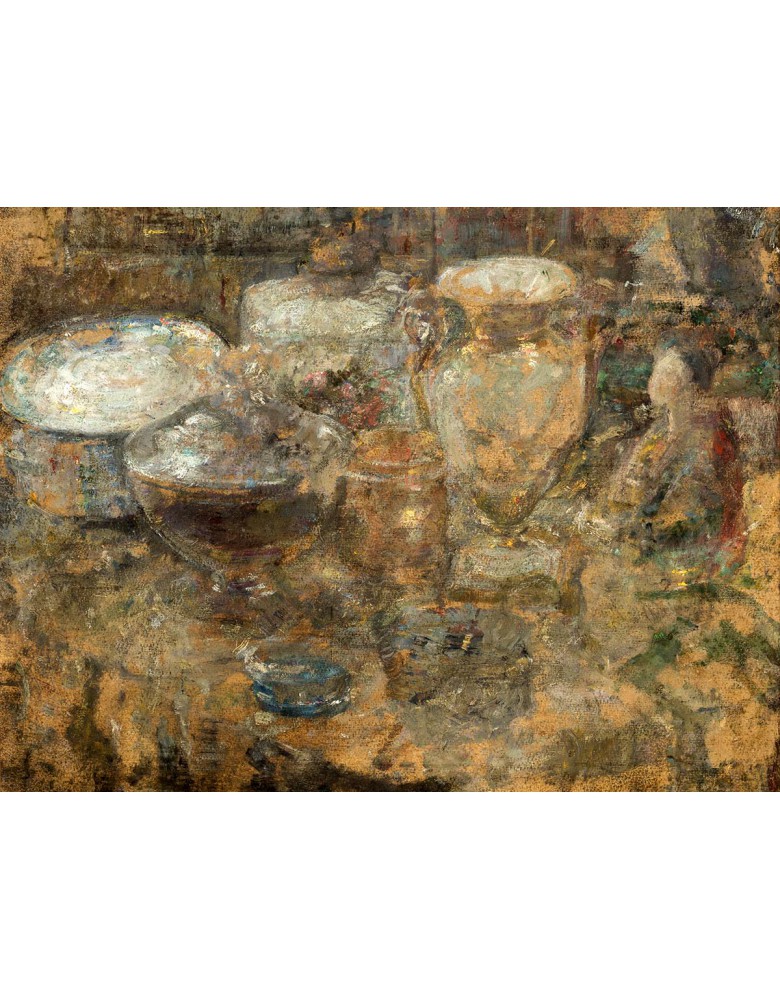 Tło utrzymane jest w złotawo-zielonych tonacjach, które miękko kontrastują z kształtami naczyń, nadając całej kompozycji ciepłą, niemal magiczną aurę. Delikatne, impresyjne pociągnięcia pędzla oraz subtelne przejścia tonalne podkreślają fakturę powierzchni i tworzą wrażenie ulotności chwili, typowe dla twórczości Boznańskiej. Każde naczynie, choć częścią większej kompozycji, zachowuje swoją indywidualność i wyrazistość, a całość harmonizuje w elegancki, spokojny obraz.
