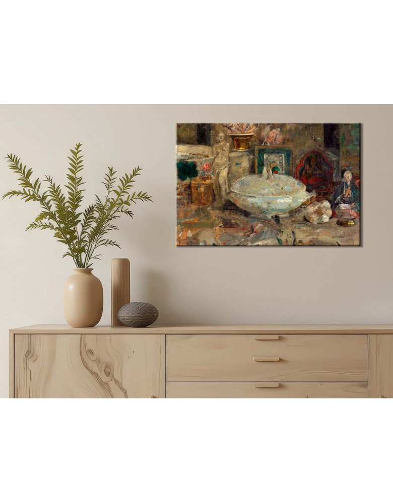Reprodukcja obrazu Olga Boznańska „Martwa natura z wazonem” to nastrojowy, elegancki obraz, w którym artystka przedstawia starannie ułożoną kompozycję naczyń, z dominującym wazonem jako centralnym elementem. Tło utrzymane jest w stonowanych, ciepłych tonach, co w połączeniu z miękkimi, subtelnymi pociągnięciami pędzla nadaje całej scenie wyjątkową głębię i malarską poetyckość.