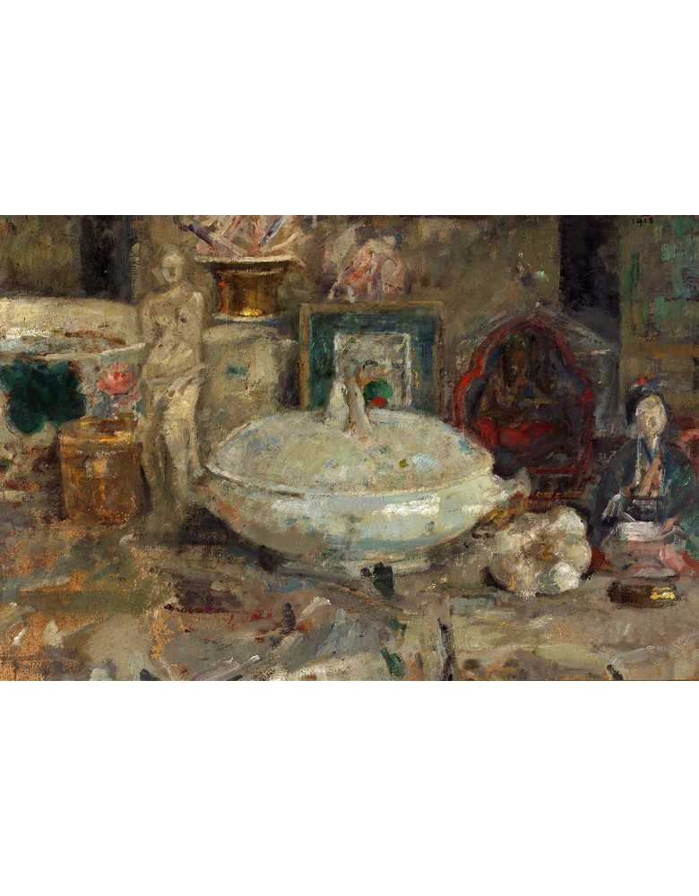 Boznańska mistrzowsko operuje światłem i kolorem, tworząc obraz, w którym każdy element – od wazonu po drobne naczynia – nabiera indywidualnego wyrazu, a całość harmonizuje w elegancką, spokojną kompozycję. Subtelne refleksy światła, miękkie przejścia tonalne i delikatne detale nadają scenie atmosferę wyciszenia i refleksji.
