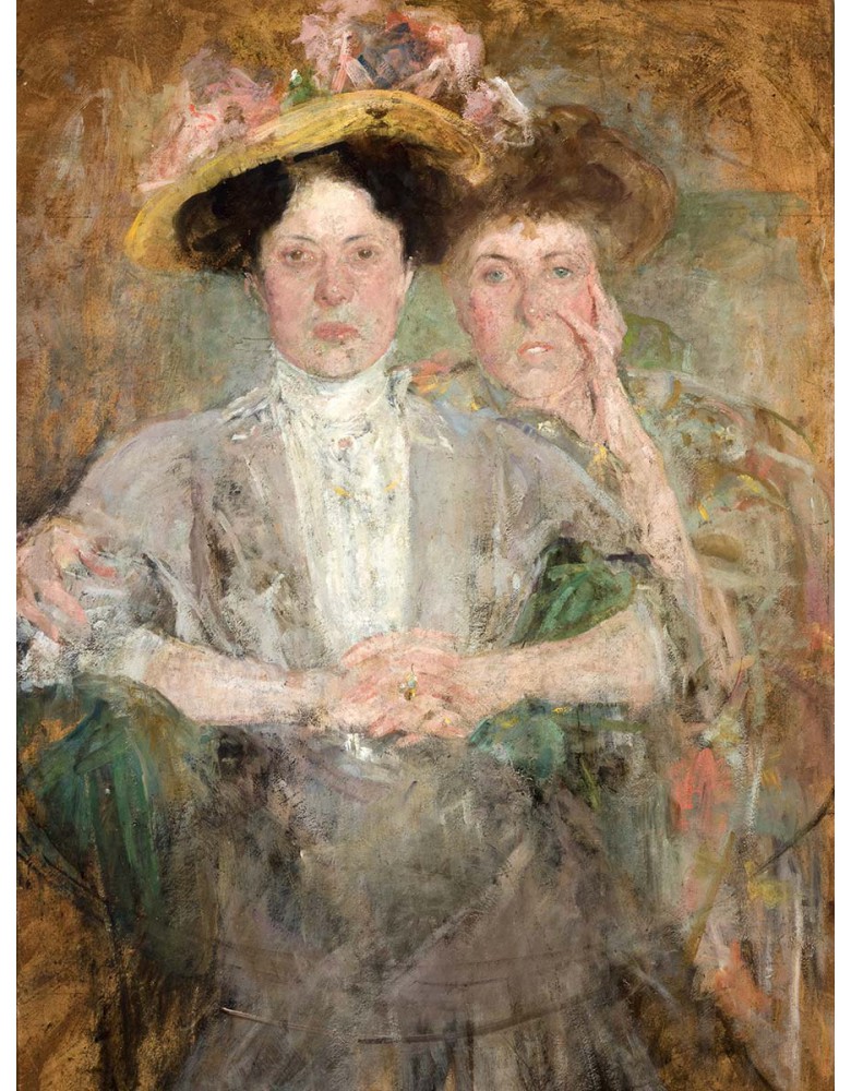 Reprodukcja obrazu Olga Boznańska „Portret dwóch młodych dam” to subtelny, pełen psychologicznej głębi obraz, przedstawiający dwie młode kobiety ukazane w spokojnej, intymnej kompozycji. Artystka z niezwykłą wrażliwością oddaje relację pomiędzy postaciami, koncentrując się na ich spojrzeniach, gestach i atmosferze ciszy, która łączy bohaterki portretu.