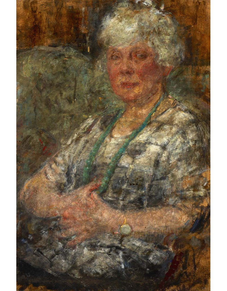 Kolorystyka obrazu opiera się na zharmonizowanych odcieniach szarości, brązów i przytłumionych zieleni, typowych dla dojrzałej twórczości Boznańskiej. Miękkie, impresyjne pociągnięcia pędzla oraz delikatnie rozmyte kontury budują atmosferę ciszy i skupienia. Spojrzenie portretowanej kobiety jest pełne refleksji i wewnętrznej koncentracji, co nadaje kompozycji głębi i ponadczasowego charakteru.