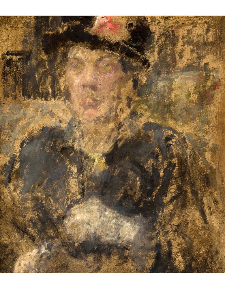 Paleta barw obrazu utrzymana jest w stonowanych odcieniach szarości, brązów oraz przygaszonych zieleni, które budują atmosferę powagi i skupienia. Miękkie, impresyjne pociągnięcia pędzla oraz delikatnie rozmyte kontury sprawiają, że postać subtelnie wyłania się z tła. Spojrzenie portretowanej kobiety jest spokojne, zamyślone i pełne wewnętrznej koncentracji, co nadaje portretowi ponadczasowy charakter.