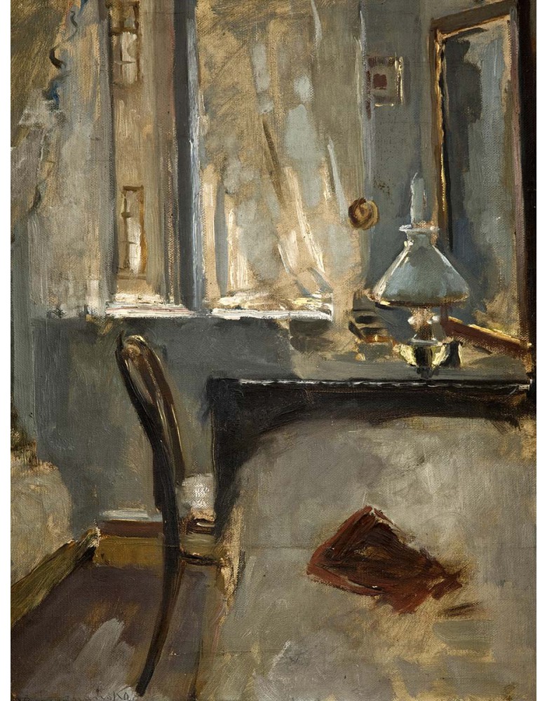 Impresyjna technika malarska, swobodne pociągnięcia pędzla oraz oszczędność detalu sprawiają, że scena nabiera charakteru wspomnienia lub ulotnego wrażenia. Olga Boznańska potrafiła z pozornie zwyczajnych motywów wydobyć głęboką emocjonalność – także tutaj wnętrze staje się nośnikiem nastroju i psychologicznej głębi.