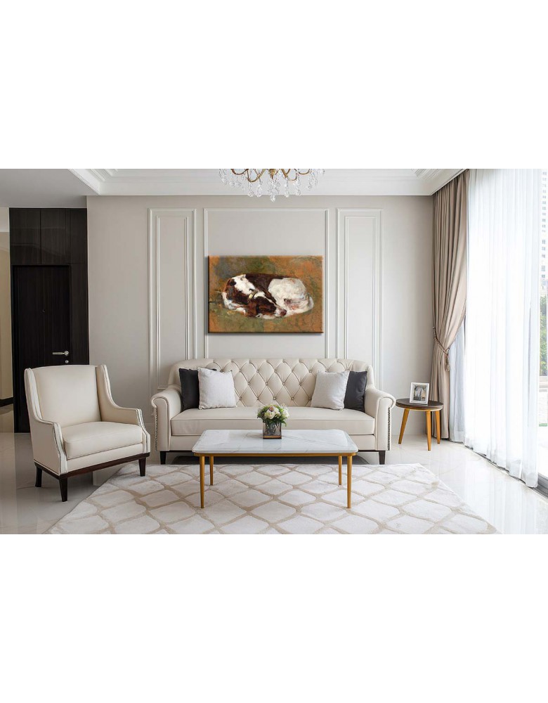 Kompozycja utrzymana jest w stonowanej, przygaszonej palecie barw – z przewagą brązów, szarości i ciepłych tonów. Pies ukazany jest w naturalnej pozycji, zwinięty lub lekko wyciągnięty, co nadaje scenie poczucie spokoju i harmonii. Miękkie, impresyjne pociągnięcia pędzla oraz subtelne modelowanie światła i cienia podkreślają ulotność chwili i emocjonalną wrażliwość artystki.
