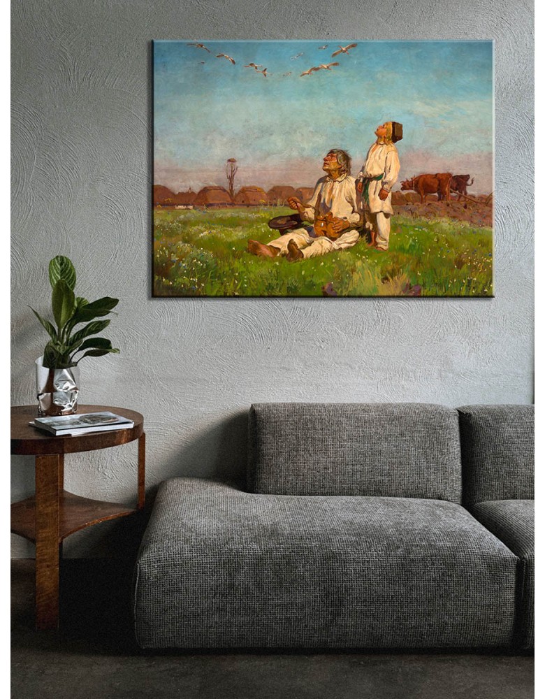 Reprodukcja obrazu Józef Chełmoński „Bociany” drukowana na wysokiej jakości płótnie. Zadrukowane boki, sosnowy blejtram 20 mm – realistyczny obraz inspirowany polskim krajobrazem, gotowy do powieszenia na ścianę.