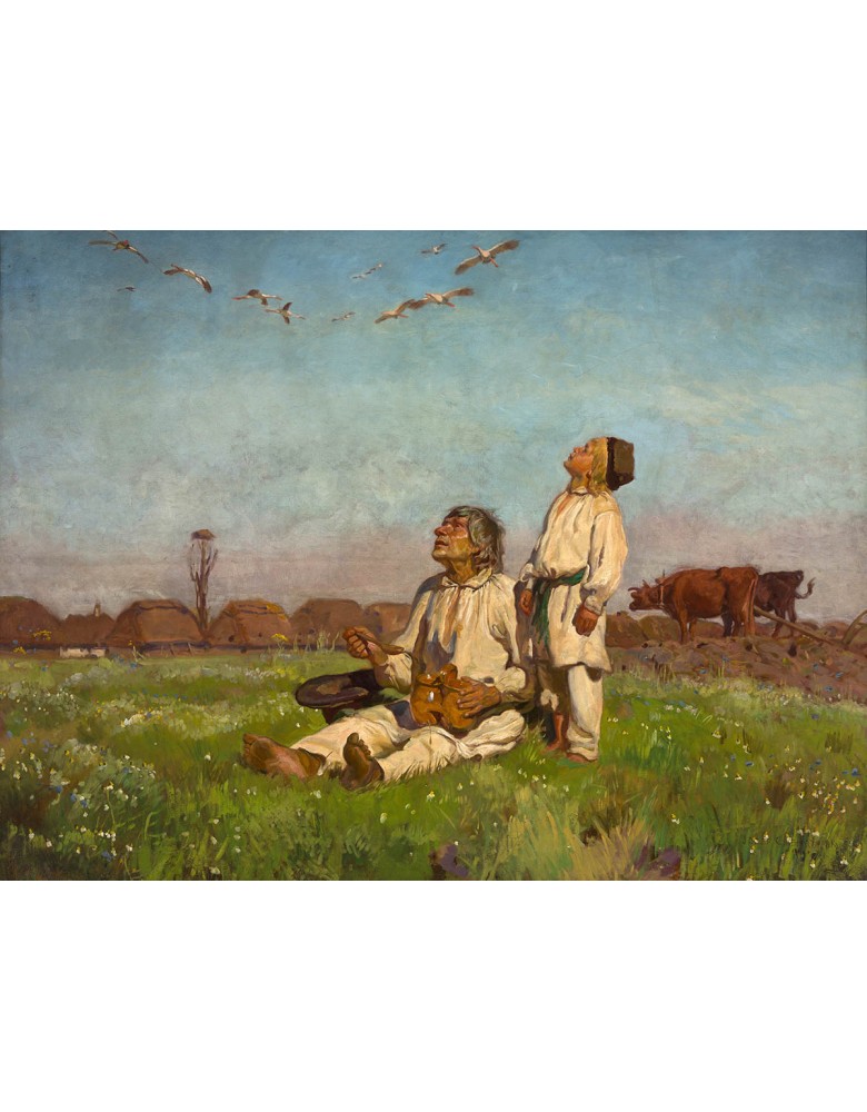 W obrazie „Bociany” Józef Chełmoński z niezwykłą precyzją oddaje przestrzeń, światło i atmosferę chwili. Rozległy pejzaż, niska linia horyzontu i monumentalne niebo budują poczucie bezkresu oraz siły natury. To obraz, który nie tylko przedstawia wiejską scenę, lecz także opowiada o relacji człowieka, zwierząt i krajobrazu, charakterystycznej dla polskiej tradycji i kultury.