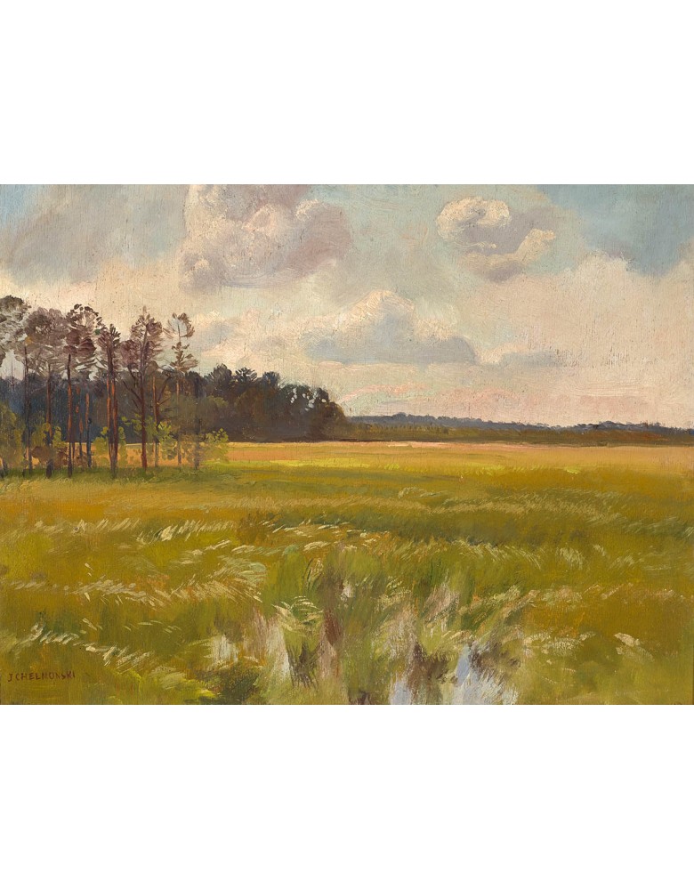 „Łąka pod lasem” to subtelny, pełen harmonii obraz autorstwa Józef Chełmoński, ukazujący spokojny fragment natury – rozległą łąkę graniczącą ze ścianą gęstego lasu. Dzieło to doskonale oddaje charakter twórczości artysty, który z niezwykłą wrażliwością przedstawiał polski krajobraz w jego naturalnym, nieprzetworzonym pięknie.