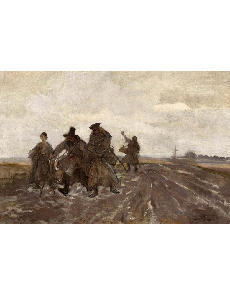 Kompozycja obrazu skupia się na motywie drogi przecinającej krajobraz. Może to być zaprzęg konny, postacie wędrowców lub scena związana z podróżą – element ruchu stanowi kluczowy akcent budujący napięcie i dynamikę. Rozległa przestrzeń, szerokie niebo i naturalny pejzaż tworzą tło, które podkreśla realizm przedstawienia. Charakterystyczna dla Józef Chełmoński gra światła i powietrza nadaje scenie autentyczności i głębi.