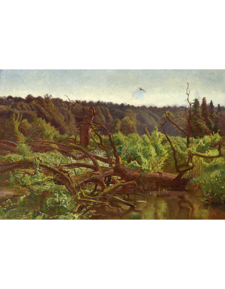 „Puszcza – wykroty leśne” to nastrojowy i realistyczny obraz autorstwa Józef Chełmoński, ukazujący dziką, niemal nietkniętą ręką człowieka przestrzeń leśnej puszczy. Dzieło oddaje potęgę natury oraz surowe piękno starego lasu, w którym powalone drzewa i wykroty tworzą niezwykle malowniczy krajobraz.