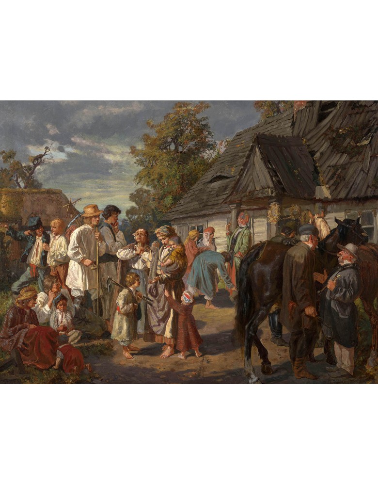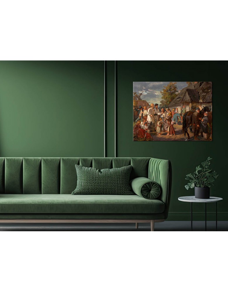 Wysokiej jakości wydruk na płótnie o dużej gramaturze, wiernie oddający detale zabudowy folwarcznej, postaci oraz zwierząt widocznych w obrazie.
